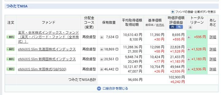 つみたてNISA運用状況(2019年4月5日現在)です。合計でプラス6,242円です。
