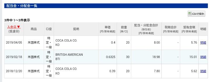 配当金受け取り状況(2019年4月6日現在)です。4月5日、20株保有しているコカ・コーラより、5.76ドルの配当金を受け取りました。