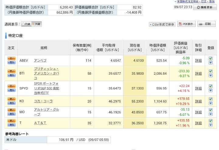 米国株運用状況(2019年9月7日現在)です。楽天証券の特定口座で保有しています。