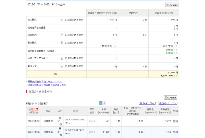 • 2025年 合計 約1,229ドル+11,000円(~11月)
