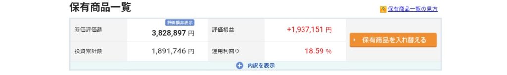 投資元本は約189万円(手数料除く)、評価額は約382万円、評価損益が+約193万円です。