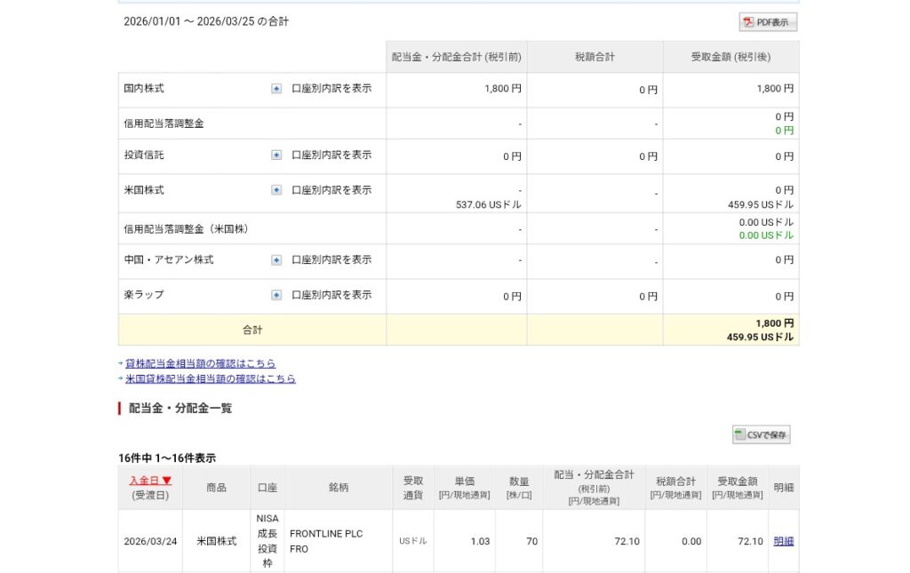 配当金(FRO 70株)受け取り状況です